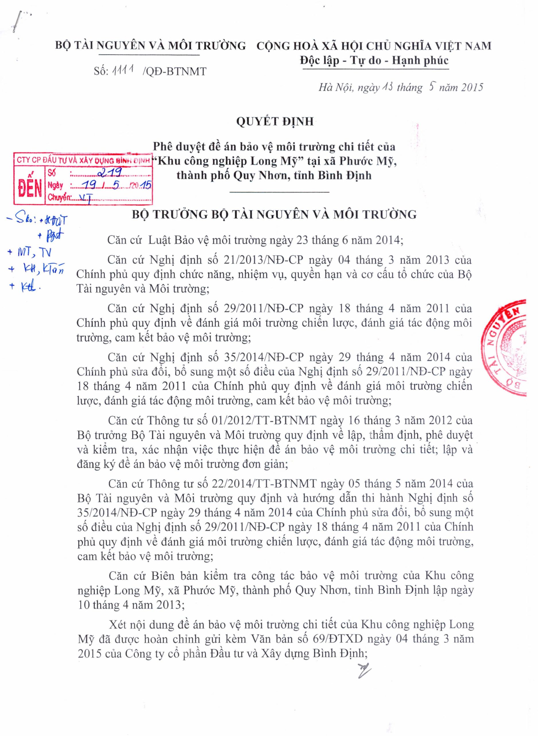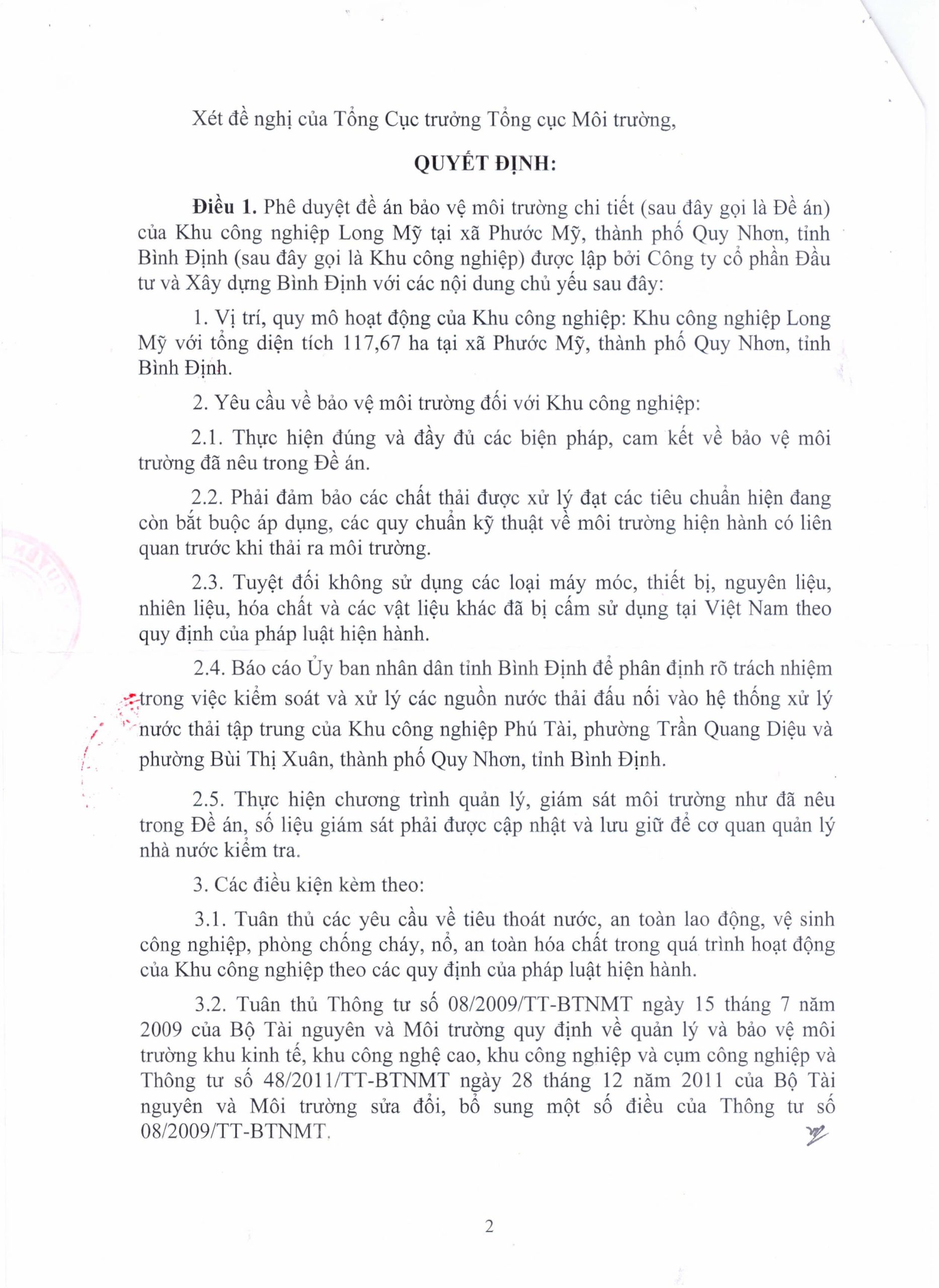 Lượng nước thải hiện nay phát sinh từ KCN Long Mỹ khoảng >100 m3/ngày đêm, thành phần chủ yếu là nước thải sinh hoạt được đấu nối vào hệ thống thu gom chung rồi chảy về các trạm bơm trung gian, sau đó được bơm đẩy về Hệ thống xử lý nước thải tập trung của KCN Phú Tài để xử lý theo chủ trương của UBND tỉnh Bình Định tại Văn bản số 423/UB-CN ngày 21/02/2005 về việc triển khai một số nội dung công việc có liên quan đối với các KCN trên địa bàn tỉnh, trong đó nước thải của các DN KCN Long Mỹ đã xử lý đạt tiêu chuẩn loại A, B, C và 1,5C theo Bảng quy định cấp độ xử lý nước thải theo từng loại hình sản xuất của các DN trong KCN Phú Tài và Long Mỹ (kèm theo Quyết định số 404/QĐ-ĐTXD ngày 13/4/2012 của Công ty CP Đầu tư và Xây dựng Bình Định- Chủ đầu tư KCN Phú Tài và Long Mỹ), được thu gom về Hệ thống xử lý tập trung của KCN Phú Tài để xử lý trước khi thải ra môi trường theo đúng quy định.