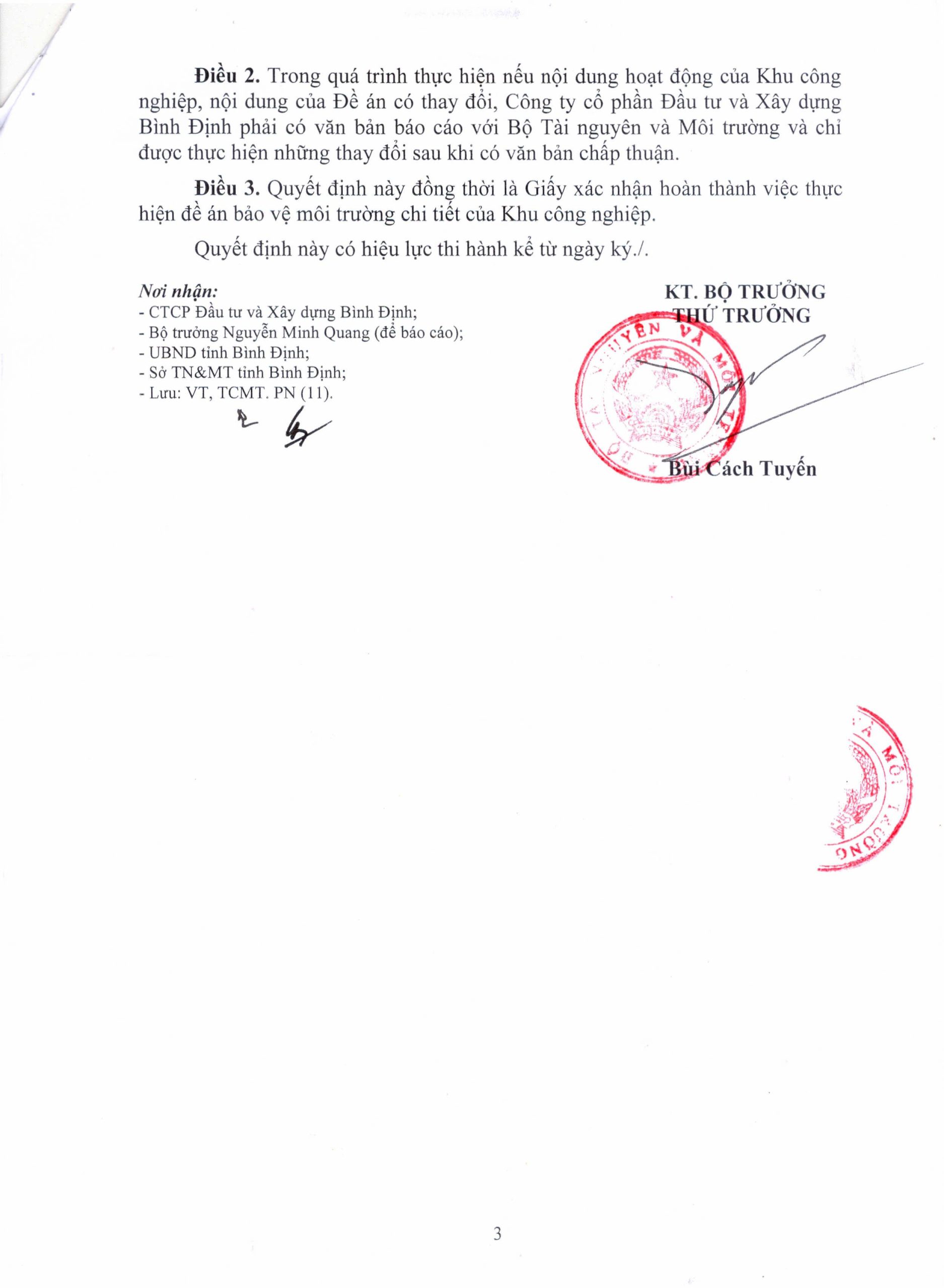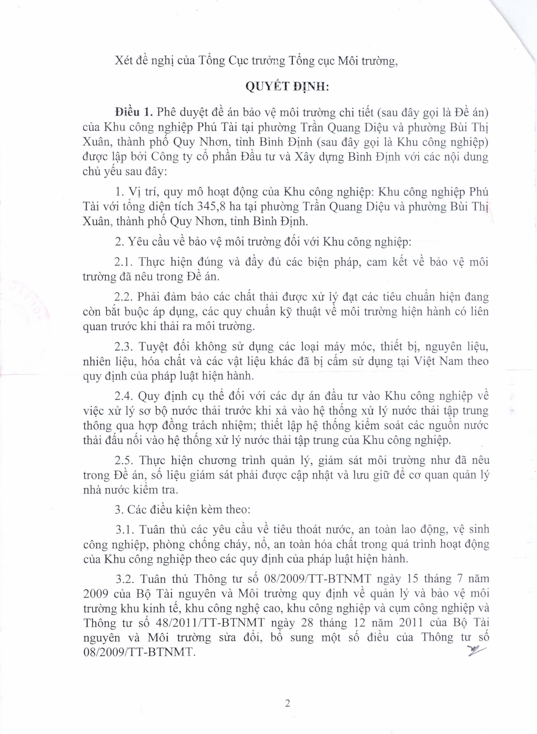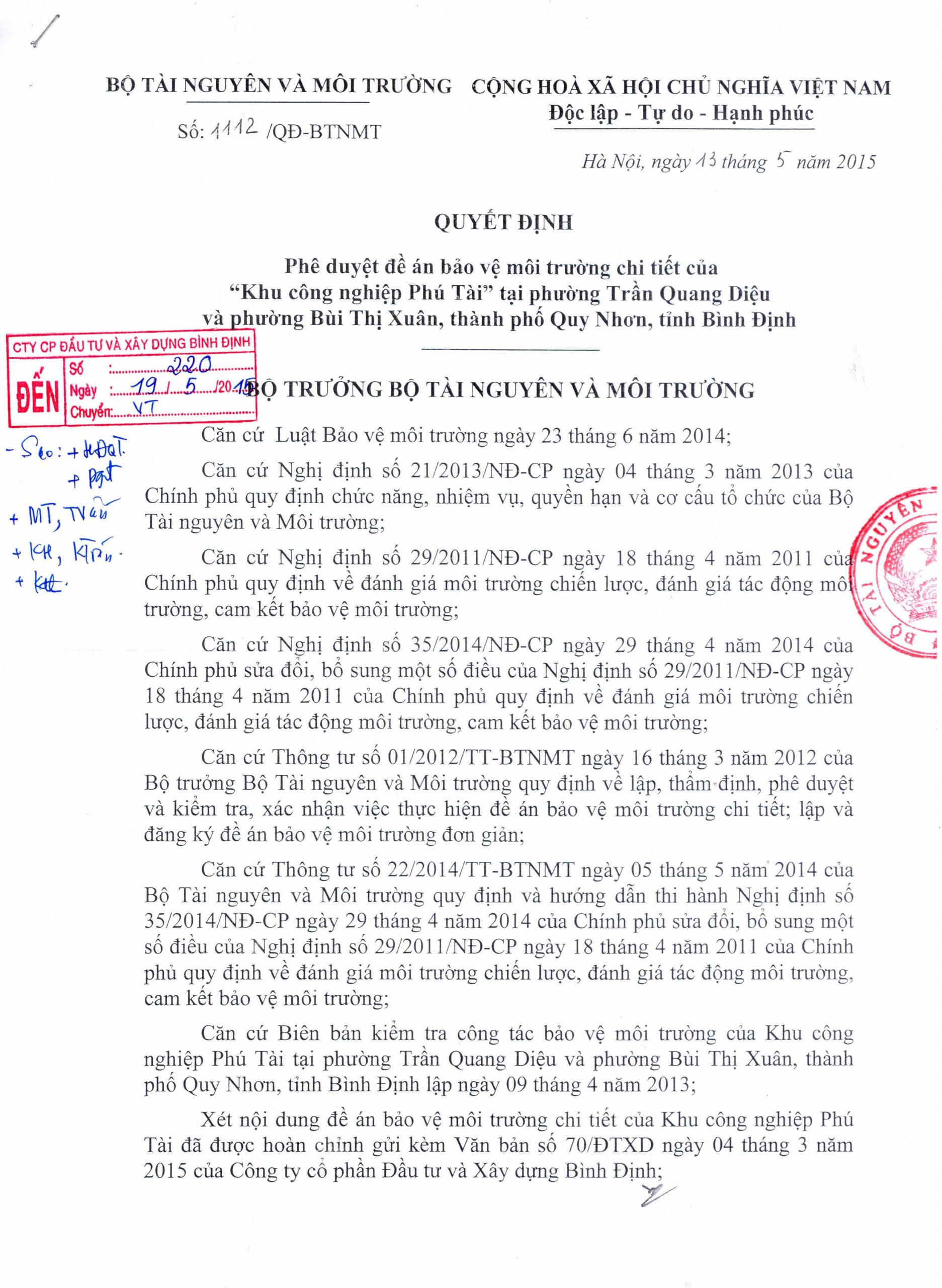 KCN Phú Tài đã lập Báo cáo ĐTM qua các giai đoạn được cấp thẩm quyền phê duyệt, cụ thể: tại Quyết định số 682/QĐ-BKHCNMT ngày 02/4/2002 của Bộ Khoa học, Công nghệ và Môi trường về việc phê chuẩn Báo cáo đánh giá tác động môi trường “Dự án: Đầu tư Xây dựng cơ sở hạ tầng khu công nghiệp Phú Tài, tỉnh Bình Định”; Quyết định số 1918/QĐ-BTNMT ngày 19/12/2006 của Bộ Tài nguyên và Môi trường về việc phê duyệt Báo cáo đánh giá tác động môi trường Trạm xử lý nước thải tập trung KCN Phú Tài; Các Quyết định số 3312/QĐ-CTUB ngày 23/11/2004; số 164/QĐ-CTUB ngày 21/01/2005; số 2089/QĐ-CTUBND ngày 01/10/2008 của UBND tỉnh Bình Định về việc phê duyệt Báo cáo đánh giá tác động môi trường KCN Phú Tài mở rộng về phía Nam, mở rộng về phía Bắc và mở rộng về phía Đông núi Hòn Chà; Đề án BVMT chi tiết cho KCN Phú Tài bao gồm tất cả các giai đoạn sau khi điều chỉnh và đã được Bộ Tài nguyên và Môi trường phê duyệt tại Quyết định số 1112/QĐ-BTNMT ngày 13/5/2015.